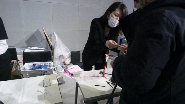 ケースの封入は3〜4分で終了するが、メディアをビニールに封入する作業はすぐに終わらない。10分間で100枚のメディア封入を2人で完了させるのは不可能なので3人体制に変更。制限時間内に商品の用意が完了した。