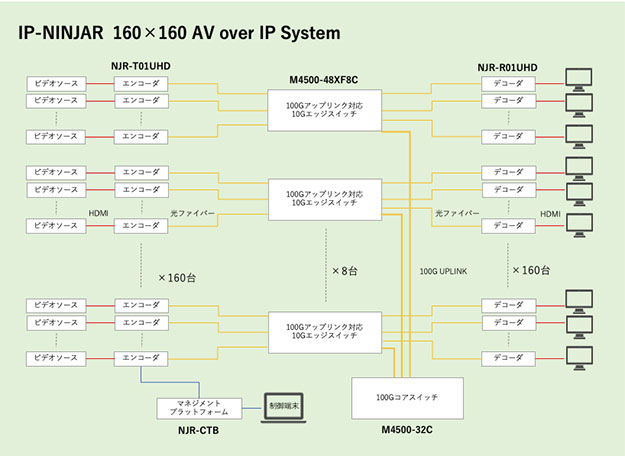 同検証では、IDKのエンコーダ「NJR-T01UHD」160台とデコーダ「NJR-R01UHD」160台、そしてNETGEARの100Gコアスイッチ「M4500-32C」1台と100Gアップリンク対応10Gエッジスイッチ「M4500-48XF8C」8台を使用。320ものエンドポイントのAV over IP機器(IP-NINJAR)の統合管理および制御を実現するIDKの機能と、正しい宛先に大量のマルチキャストトラフィックをルーティングおよび管理するネットギアの機能により、IP伝送でも従来のマトリクススイッチャシステムと同様に、遅延することなくスムーズな映像伝送が可能であることを実証したという。