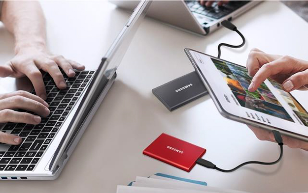 PCIe NVMeテクノロジとUSB3.2 Gen2インターフェースを組み合わせたT7は、シーケンシャル読み出し/書き込み速度を最大1,050/1,000MB/sまで向上させ、現行モデルPortable SSD T5と比べて約1.9倍、外付けHDDと比べて約9.5倍の転送速度を実現したという。