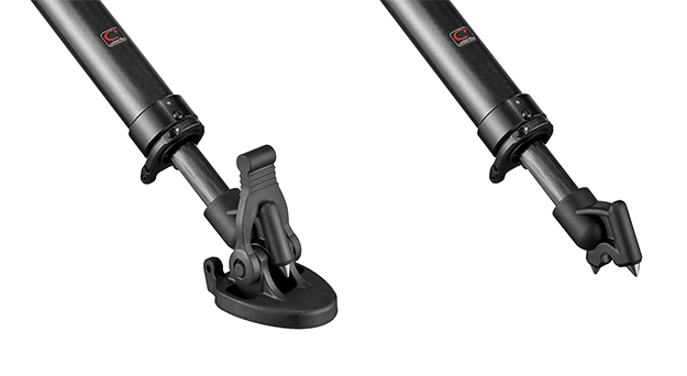 脚の先端にはラバーシューが装着されているが、取り外すとスパイク石突に早変わりするので、様々な撮影環境で振動やブレの少ない安定性を得ることができる。