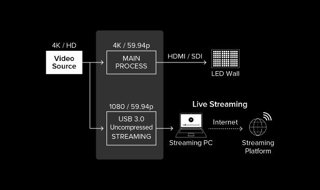 4K/HDRの映像をHD/SDRに高品質にダウンコンバートし、パソコンでキャプチャしてライブ配信に使用することも可能。4Kの映像を非圧縮USB Video Class(UVC)として映像を出力することで、エンコーダーとなるパソコンの負荷を減らしつつ、高画質な配信を実現。オーディオもUSB Audio Class(UAC)出力に対応。音声ラインにはマスタリングエフェクトとディレイを搭載しており、エンコーダーPCで発生する映像の遅延に合わせて音声を遅らせ、リップシンク(映像と音声の同期)を保つことが可能。