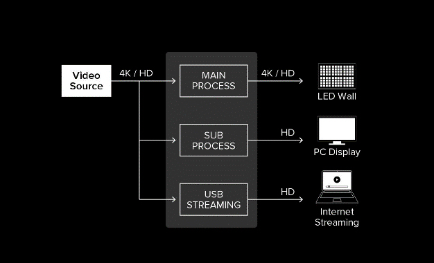 VC-100UHDの内蔵プロセスは、同時に最大3系統の映像処理が可能。4K対応のMain、HD対応Subの2系統の処理に加え、USBストリーミング処理専用のプロセスを採用。それぞれ独立した映像処理が行える。12G/3G/HD対応のSDI、最大4K対応のHDMIをすべての入出力端子に搭載。映像入力端子と出力フォーマットを選ぶだけで、自動的に内部処理を決定して映像を出力する。
