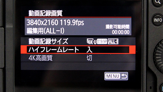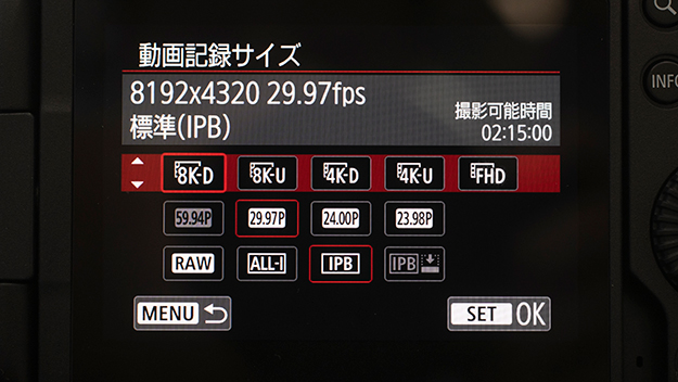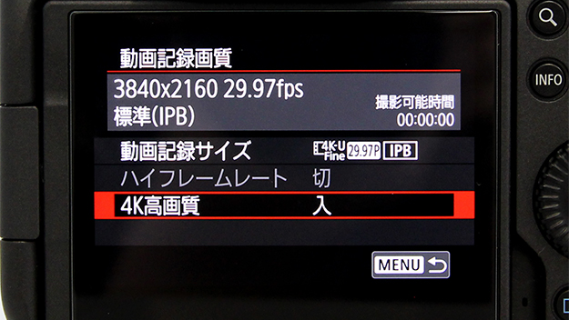 4K高画質設定を「入」にすると8Kからのオーバーサンプリングとなる。8Kで読み出すため、フレームレートは最大で29.97Pまで