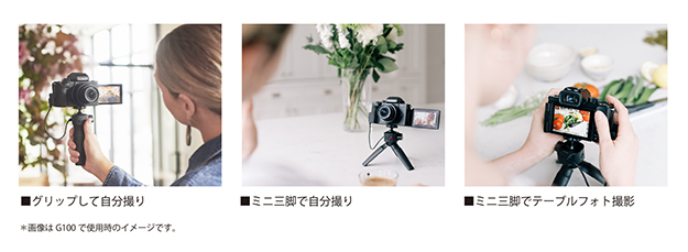 同ファームウェアで対応となるトライポッドグリップ(DMW-SHGR1)は、静止画シャッターボタン、動画記録ボタンなどの3つのボタン(GH5、GH5S、G9、G99、G8ではスリープボタン機能は使用不可)を搭載し、撮影中にグリップしながらでも快適に操作でき、自分撮りやVlog撮影をサポート。静止画シャッターボタンは、撮影時のピント合わせや撮影が可能。動画記録ボタンは、記録の開始と終了をワンボタンでコントロールできる。またグリップ部の脚を開くことで、ミニ三脚としても使用可能。