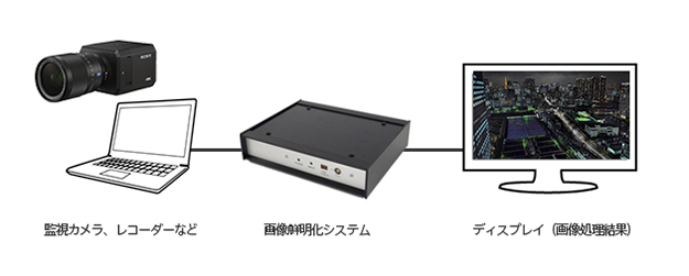 4K/HDに対応しており、鮮明な映像が求められる放送局の情報カメラや、工場内の監視カメラ、社会インフラ企業における河川監視や港湾監視、空港監視、視認性の悪い記録映像の再利用など活用してほしいとのこと。なお同システムは、ソニービジネスソリューションが映像入出力ユニット(株式会社ジーニック社製)に画像鮮明化プログラムを搭載した上で、販売を行う。同システムの概要は以下の通り。