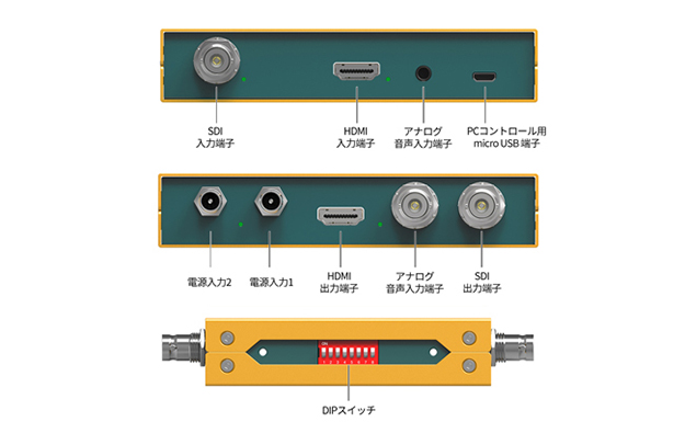 また、専用ソフトウェアによるPCからUSB接続にてコントロールでき、入力端子の切替えや出力信号フォーマットなどを設定することが可能。電源入力は6~23Vの広範囲電圧に対応したネジロック式のDC入力端子を2系統搭載。万一の断電やアクシデントに備えて冗長化された設計となっているほか、最大消費電力約4Wの超低消費電力設計により、PCコントロール接続用のmicro USB端子へ5V/1.5Aを供給することでコンセント不要で動作可能。USB充電ACアダプターやモバイルバッテリーを使用することで、あらゆる環境で利用できるとしている。主な特長は以下の通り。