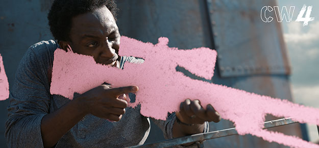 真のコラボレーション形式のワークフローを通して、Chalk Warfareでは数々の奇抜なセットやシーケンスだけでなく、ウィッカート氏やインハウスのVFXアーティストであるブレンダン・フォード氏、さらには国中の様々なアーティストによる膨大な数のコンピューターアニメーションが統合された。その作業には膨大な量の3DトラッキングやパーティクルFX、流体力学が含まれた。フォード氏は主に武器のトラッキングに専念し、ウィッカート氏は3Dシーケンスのチョークの統合を処理した。すべての素材はDaVinci Resolve StudioのFusionで合成された。