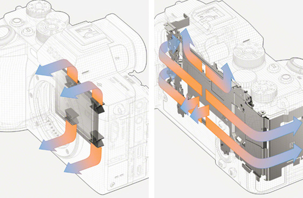 撮影中の温度上昇を抑制するため、イメージセンサーから画像処理エンジン、各種回路設計すべてにおいて細やかな制御を行うことで、低消費電力を実現。カメラの内部構造やパーツを新たに設計し、イメージセンサーや画像処理エンジンの駆動に伴う熱を効果的に分散し放熱させることで、バッテリー容量を使い切るまで、1時間を超える4K60p動画記録が可能※。