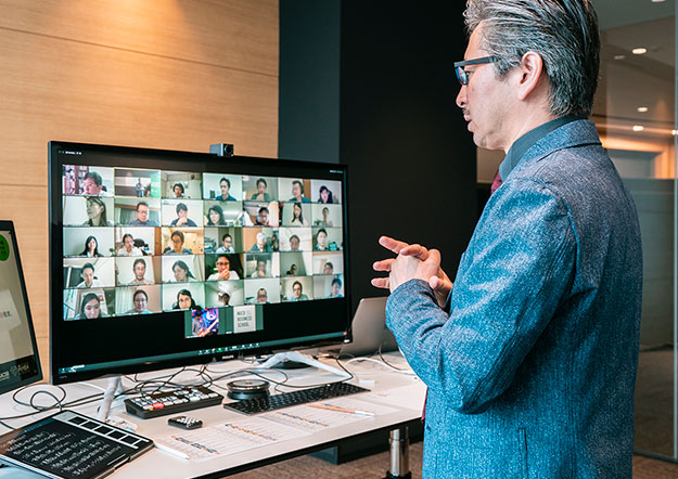 同校では、複数台のパソコンを組み合わせて遠隔授業を配信している。1台は教員の映像音声の配信用とし、もう1台はiPadやプレゼン資料をATEM経由で入力する共有画面の配信用である。以前の大規模なスタジオではATEMスイッチャーはカメラ映像の切り替え目的で使われていたが、今回のミニスタジオでは参加者の発言を教授が書き込み、プレゼン資料と切り替えながら授業を進行させている。