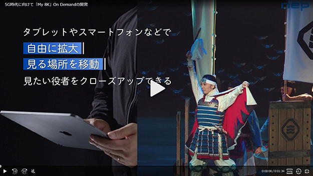 舞台全体を1台の固定8Kカメラで俯瞰的に撮影することで、撮影コストを大きく削減できるほか、元映像は8K高解像度で撮影を行っているため、拡大しても細部まで精細に見ることが可能。また、My 8Kは視聴範囲のみを切り出し、最低限の映像データをストリーミング配信することができる。視聴部分のみの映像データを送ることで、ズームした際も、高精細な映像配信を低ビットレートで可能とする。なお、映像の事前ダウンロードは不要。