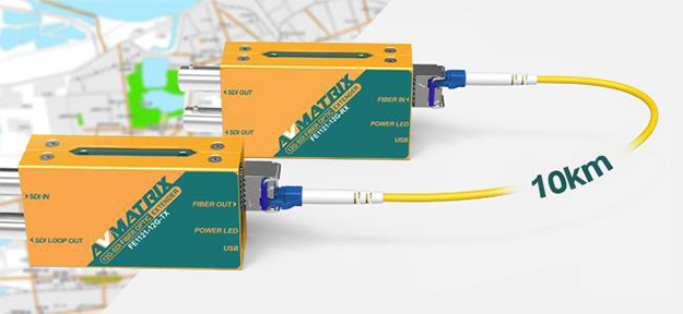 FE1121-12Gは、12G-SDIまでのSDI信号を最長10kmまで伝送できる光延長器(送受信機セット)。送信機側にSDI入力端子とSFP光伝送モジュール端子(送信側)を搭載している。入力された12G/6G/3G/HD/SD-SDI信号を波長1310nmシングルモードの光信号に変換・出力する。付属のSFPモジュールはLCタイプコネクタの伝送に対応し、光ファイバーケーブル1本で送信機と受信機間を最長10kmまで信号伝送する。また、送信機側にはLOOP出力端子を搭載しているので、デイジーチェーンや送信機側での映像確認が可能。