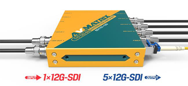 SD1151-12Gは、リクロック機能搭載12G-SDIで最長60mまでのケーブル補償に対応しており、入力されたSDI信号を5分配出力する分配器。入力信号はSMPTE規格に準拠した12G-SDIまでの信号に対応するほか、DVB-ASIにも対応する。また、入力信号に重畳されるタイムコードデータやエンベデッドオーディオデータは、すべての出力端子にそれぞれ分配出力される。