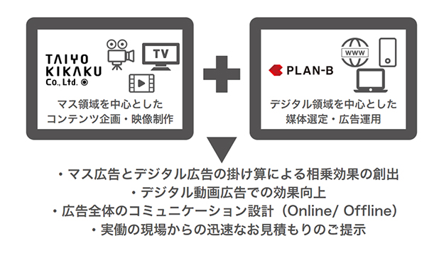 太陽企画とPLAN-B、両社のノウハウと経験値を組み合わせることにより、お客様の課題に合わせた広告制作・マーケティング全体の統合的サポートで、企業の広告効果の最大化を目指すとしている。