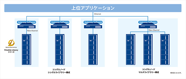 同ソフトウェアは、オプティカルディスク・アーカイブ商品(以降、同社商品)とHDDやSSDなどのストレージシステムとの連携により、コールドデータの円滑な統合管理を実現するミドルウェア。「オプティカルディスク・アーカイブPetaSite(ペタサイト)拡張型ライブラリー「ODS-L30Mシリーズ」を複数束ねて、ストレージ容量と性能の拡張および冗長性の向上を可能にする。