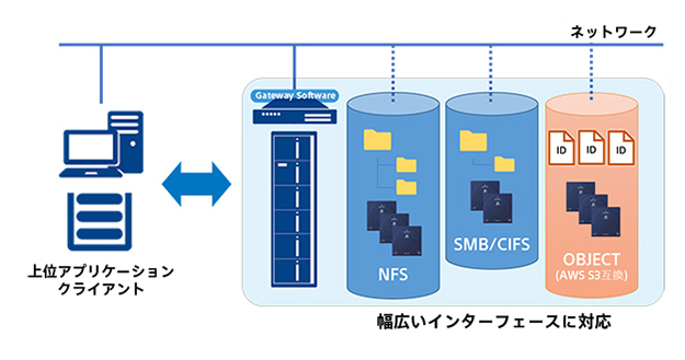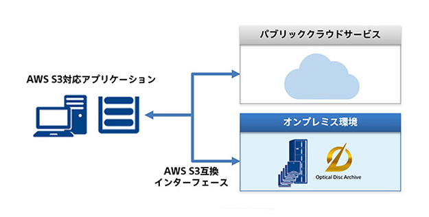 接続インターフェースとして、オブジェクトストレージサービスで代表的に利用されるAWS S3互換インターフェースに対応しました。標準的なファイルインターフェースとしてNFS、SMB/CIFSプロトコルにも対応し、ストレージ領域ごとに利用方法を選択できます。豊富な接続インターフェースの採用により、1つのシステムでさまざまなユーザーにアーカイブボリュームを提供することができます。新開発のAWS S3互換インターフェースを用い、クラウドサービス利用とオンプレミス管理の両立を実現できることで、ハイブリッドクラウド環境下でオプティカルディスク・アーカイブのメリットを最大限に生かしたアーカイブストレージの構築が可能となります。