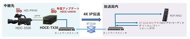 本機は、既存のシステムカメラ※1と組み合わることで、HD映像・音声信号※2などの双方向伝送に対応し、中継先など放送局から離れた環境での機動的なリモート制作を実現します。さらに、新たに2021年3月リリース予定の有償4Kアップデートソフトウェア「HZCE-UHD30」を追加することで、システムカメラ「HDC-3500」との組み合わせで※3高画質4K映像のIP伝送にも対応します。※1「HDC-3500」「HDC-3100」「HDC-2500」「HDC-2400」