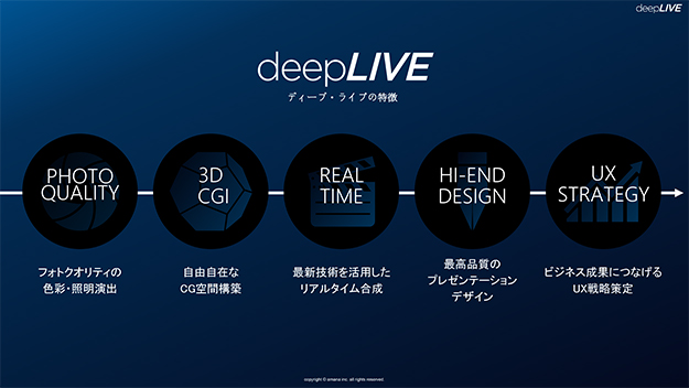 「deepLIVE」では、CGIを駆使した世界観の構築、プレゼンテーションの情報的&視覚的デザイン、またブランドや製品をリアルよりもリアルに可視化(ビジュアライズ)する専門チームが、企業の各種プロモーションニーズや、クリエイティブ・コミュニケーションの課題を解決するとしている。「deepLIVE」の特徴は以下の通り。