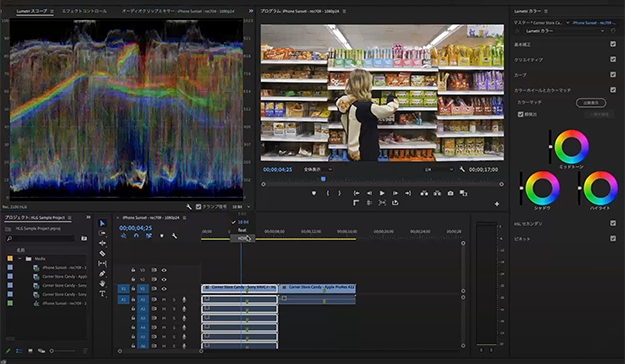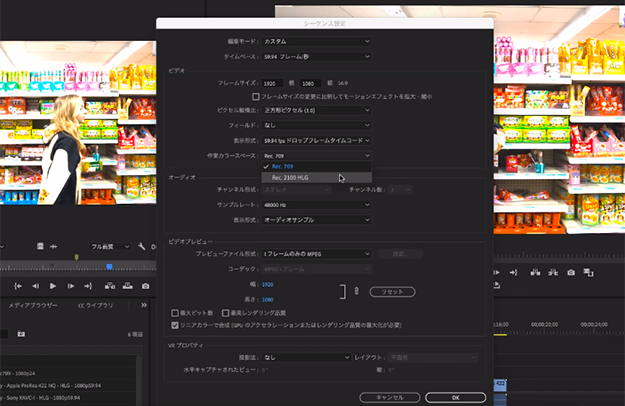 (04)さらに、Rec.2100 HLGもウェーブフォームモニターで確認可能。カラースペースの設定に「HLG」が選択できるようになった。新バージョンの登場でHDRワークフローがPremiere Proでも増えそうだ。