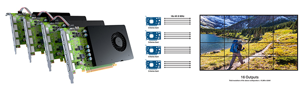 Matrox Dシリーズは、1枚で最大4つの4K60p映像出力が可能。ビデオウォールシステムをはじめ、デジタルサイネージ、プロフェッショナルAVシステム、セキュリティ分野など様々な用途に対応する。