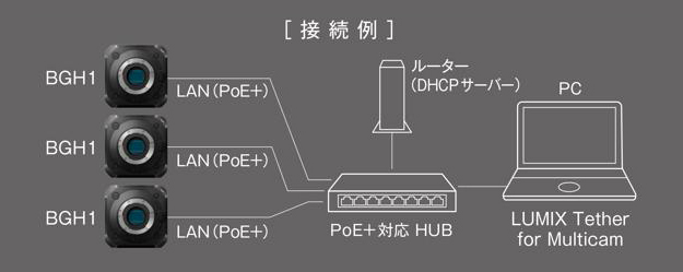 カメラとPCをLAN、USBまたはWi-Fiで接続すると、機器設定や撮影のスタート・ストップ等をPCからカメラに指示でき、同ソフトウェアを使用することで静止画撮影も可能。同ソフトウェアは複数台(最大12台)の「LUMIX DC-BGH1」を制御することが可能。1台のPC画面上から接続中の全てのBGH1を制御できるため、少人数での撮影現場でも便利だとしている。それぞれのカメラのライブビューを順に表示できるので、カメラごとの映りのチェックも容易だという。