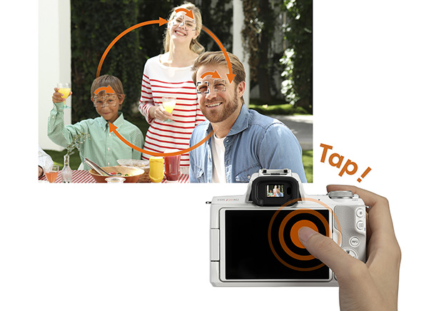 さまざまなアングルで撮影可能なバリアングル液晶モニターを搭載。タッチ操作にも対応している。また、約236万ドットの有機ELパネルを採用した視野率約100%の高精細EVFを内蔵している。キヤノンのレンズ交換式カメラ初となる「タップで被写体選択」の機能を搭載し、EVF内に表示されている顔/瞳を対象としたAFフレームの位置を、液晶モニターをタップすることで簡単に切り替え可能。