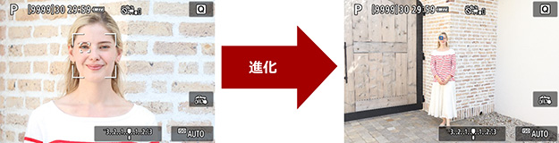 対応する交換レンズ装着時は、画面の約88%(横)×約100%(縦)の測距エリアを実現している。AFエリア自動選択時、最大143分割の測距エリアで高速・高精度なピント合わせを実現。被写体の瞳を検出してフォーカスを合わせる「瞳検出」がサーボAF/動画サーボAF時にも使用できるようになり、動く人物の表情も撮影することができる。EOS Kiss Mと比べて「瞳検出」の性能が向上し、バストショットの構図だけでなく、被写体の全身が写っている構図でも瞳を検出可能。