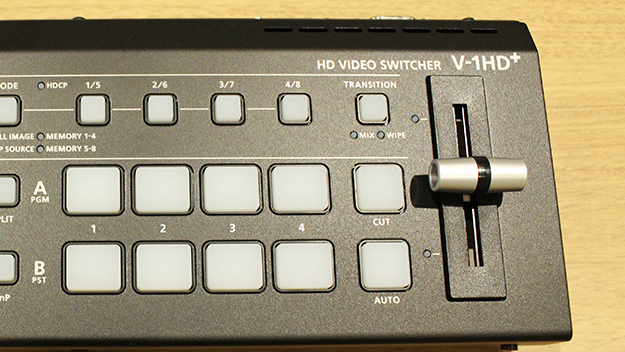 V-1HD+での基本的な映像の切り替えは、プロ仕様のビデオ・スイッチャーでよく使われているPGM/PST(メイン映像/次に出すプリセット映像)のスイッチングやTバーを用いたオペレーションを採用。Tバーにより、音楽のテンポに合わせてフェードイン/フェードアウトしながら映像を切り替えるような演出が行える。またその他、頻繁に操作する機能を個別のボタンで配置。画像やテロップを合成するDSKのON/OFF、ミックスやワイプの映像切り替え効果を加えるトランジションの種類、ピクチャー・イン・ピクチャー、エフェクトのON/OFFなど簡単に操作可能だ。オーディオでは、各音声入力のゲイン(感度)や音量、全体の音量を調節するボリュームつまみ、音割れ防止のリミッターON/OFFボタン、音量のピークを示すLEDなどを備えており、直感的に音声を調整できる。