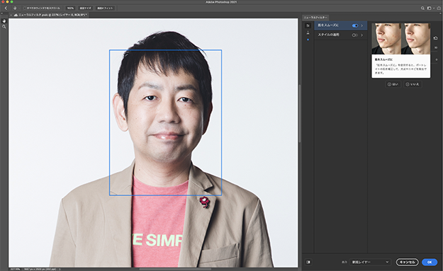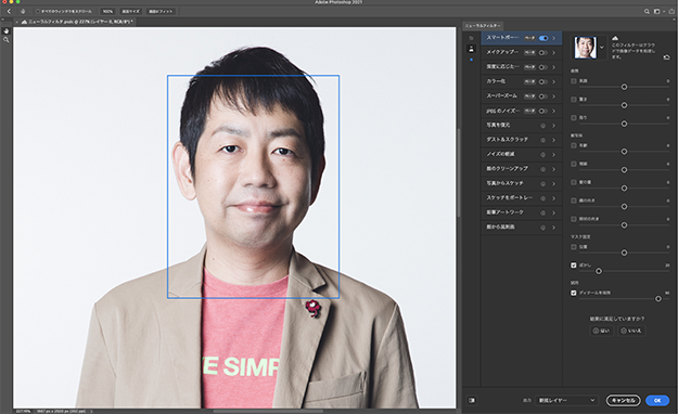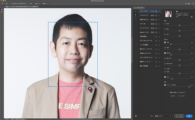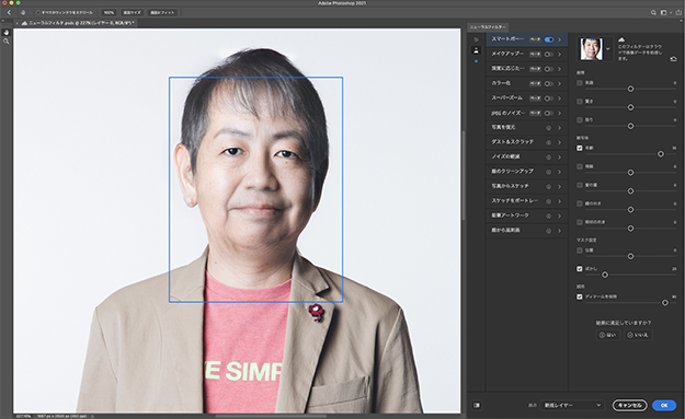 新しく搭載された「ニューラルフィルター」の「スマートポートレート」のインターフェイス