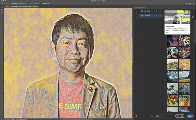ニューラルフィルターの第一弾として、Photoshopでよく使われる「肌をスムーズに」と「スタイルの適用」をおすすめのフィルターとして搭載している。