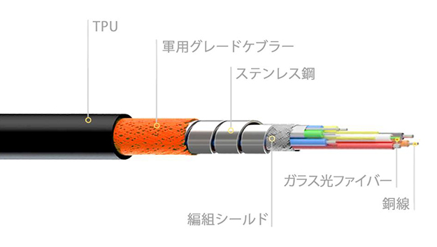 ケーブル被覆は4層構造になっており、耐ノイズ用の編組シールド、螺旋構造のステンレス鋼、防弾チョッキにも使われる軍用グレードケブラー、柔軟で伸びが良いTPUの順番に光ファイバと銅線を覆っている。この構造により最大2000N(203.9kgf)の圧力に耐えられる優れた圧壊強度と、最大800N(81.6kgf)の高い引張強度を持ちながら、許容曲げ半径10㎜に耐えられる柔軟性を実現した。