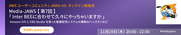 また事業者の垣根を越え、業界の職人が集結して勉強会を繰り広げているコミュニティMedia-JAWSでは、19日の夜時間に「Inter BEEに合わせて久々にやっちゃいますか」と題したオンライン勉強会を実施する。当日は、実際に手を動かしてもらうハンズオンの時間のほか、エフエム和歌山、HTB北海道テレビ、TBS、エクセラクス社からセッションがある。グループに加入しなくても参加可能。