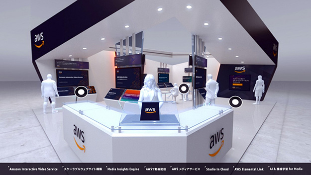 バーチャルブースでは、8つの展示コーナーにて、ハンズオンの紹介(チュートリアル)と関連資料を提供する。ハンズオンでサービスを体験している際に難しいところが発生したら、チャット機能からリアルタイムでAWS技術専門スタッフよりサポートを受けられる。バーチャルブース内では、簡単にライブ動画配信ができるフルマネージド型サービス「Amazon Interactive Video Service(Amazon IVS)」、現地のライブ映像ソースを直接AWSクラウド上のライブ動画処理サービスに転送するハードウェア製品「AWS Elemental Link」についても、動画で詳しく紹介する。