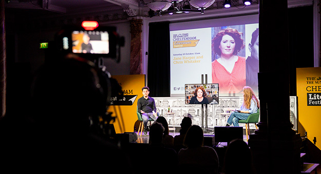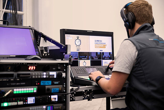 今年のヘイ・フェスティバルにおける300以上のイベントをオンライン配信した実績が買われ、Cheltenham Literature Festivalの制作依頼を受けました。この文学祭での大きな違いは、イベントの開催場所で制作し、会場のスクリーンに映像を映し出すと同時に、オンライン視聴者に対してデジタル配信を行なったことです。