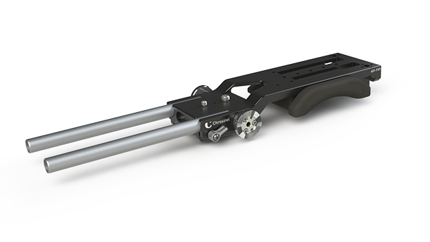 ショルダーパッドを搭載し、ENGスタイルでの撮影に適している。底部にはV座金がついており、401-150(別売)などのクイックロックプレートにそのまま装着可能。V座金を外してトライポッドアダプタープレートに交換すれば、カメラネジにも対応する。15mm径ロッド2本にさまざまなアクセサリーを取り付けられる、拡張性の高いデザインとなっている。