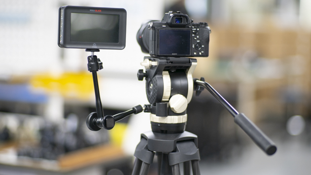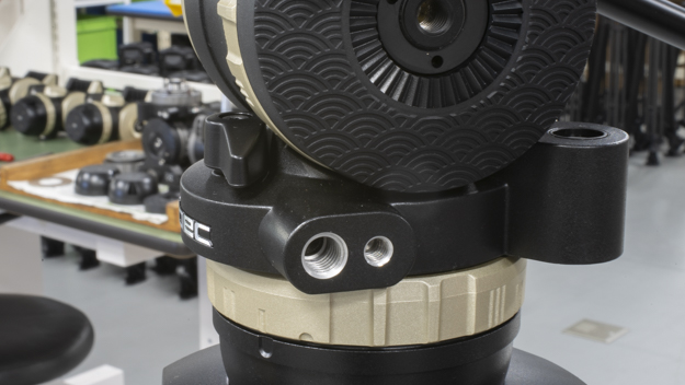 カウンターバランスの影響を受けないベース部分に、アクセサリーポートを搭載。3/8インチネジと1/4インチネジのネジ穴を搭載している。重量のあるアクセサリーを載せてもカウンターバランスに影響を与えないので、オンカメラモニターやLEDライトが搭載可能だ。
