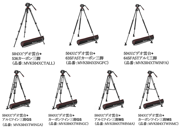 504Xビデオ雲台と三脚のキットを7製品発売。全ての三脚キットにはキャリングバッグが付属する。ラインナップと希望小売価格は以下の通り。