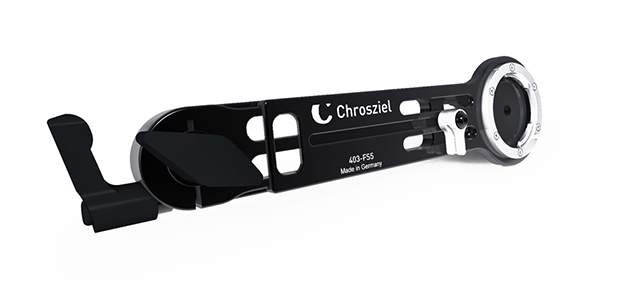 FX6用のハンドグリップエクステンダー。バヨネットロック付きで、175mmから250mmまで延長可能。クロジール製のFX6用ライトウェイトサポート(401-FX6)と組み合わせて、またはハースロゼットを使用し、カメラに直接取り付けて使用可能。