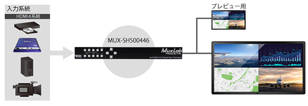 MUX-SH500446は、4入力2出力に対応するマルチビュープロセッサー。4K60P(4:4:4)入出力に対応し、最大4つの映像信号を1画面に合成してディスプレイに表示する。2つの出力用HDMI端子から同一の映像を出力し、2出力のうち1出力はプレビュー用途に最適だという。プリセット登録した単画面や画面合成のレイアウトは、黒画面を挟むことなくシームレスに切り替え可能。入力画像の任意のエリアをクリッピングしたり、最大4つの入力ソースを自由に設定して合成・分割表示も可能。また、RS-232やネットワーク経由による外部制御も可能だ。