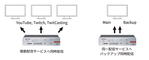 今回のアップデートで、同じ番組を最大3つのRTMPストリームへVS-Rシリーズ本体だけで容易に安定したサイマル配信を行うことが可能となる。また、YouTubeなどメインのストリームサーバーとバックアップサーバーを持つ配信サービスに対してはVS-Rシリーズ本体のみで、同時に別のRTMPアドレスに送出することも可能だという。
