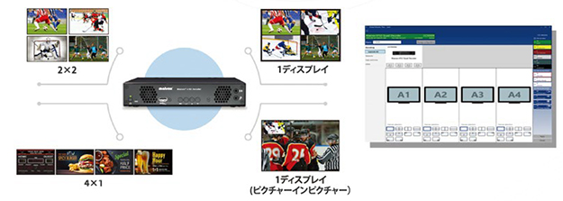 無償提供の専用ソフトウェア「Matrox PowerStream Plus」に搭載された多数のプリセットを利用して、複数のストリームを1つのディスプレイに表示でき、様々なサイネージや複数カメラの監視を容易に実現する。