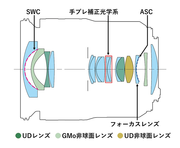 「UDレンズ」2枚、「UD非球面レンズ」1枚、「ガラスモールド非球面レンズ」2枚を含む12群16枚の光学設計により、画質劣化の原因となる諸収差を低減し、焦点距離14mmから35mmのズーム全域で中心部から周辺部までの高画質を実現しているという。