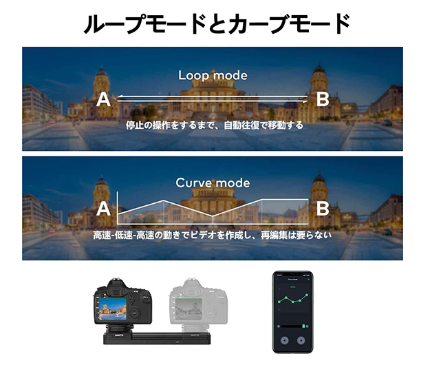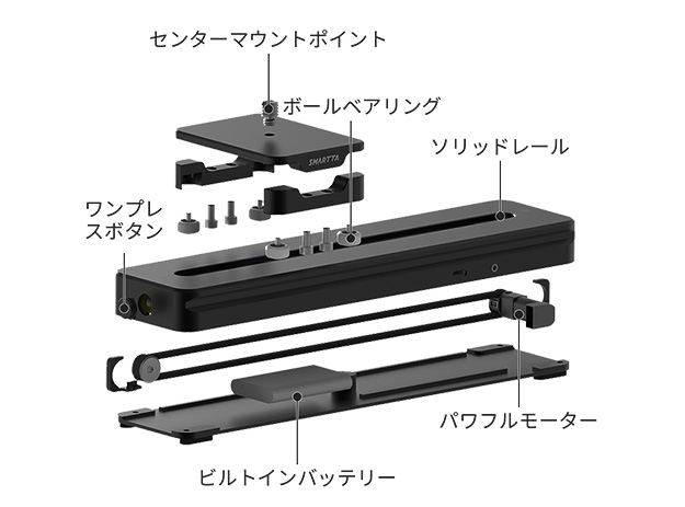 本体の電源ボタンだけでも簡単な左右スライドができ、専用アプリ「Smartta Go」(IOS、Android対応)でシームレスに最小0.01cm/sから最大1cm/sのスピード調整だけでなく、区間ごとのスピード調整やループ移動も可能。さらにシャッターケーブルをカメラと本体を接続すれば、モーションタイムラプスやストップモーション撮影容易に実現するとしている。