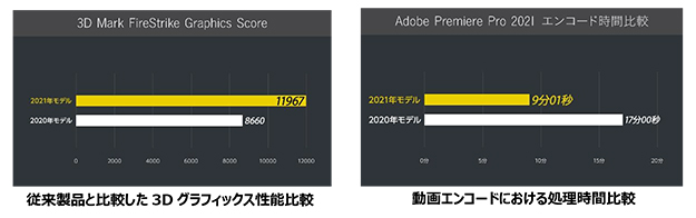 グラフィックスを「GeForce GTX 1650 Ti」から「GeForce RTX 3050 Laptop GPU」へアップグレードしたことで、従来製品よりも3Dグラフィックス性能が約1.3倍向上。Adobe Premiere Pro 2021における動画のエンコード時間では約46.9%の時間短縮を実現している。