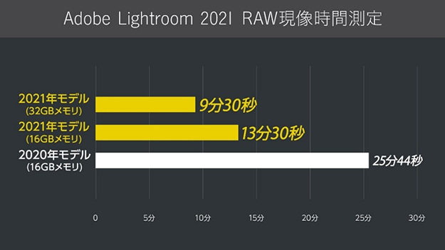 また、メモリスロットを2本にすることでデュアルチャネル動作に対応。従来製品と比較し速度の向上したDDR4-3200のメモリを標準搭載している。同製品のAdobe Lightroom 2021におけるRAW現像に要する時間は、約13分30秒と、シングルチャネル構成(16GB×1)だった従来製品の約25分44秒と比較して、作業時間が約47.5%短縮された。さらに、32GB搭載モデルでは約9分30秒と、16GB搭載の標準モデルから作業時間が約29.6%短縮される。