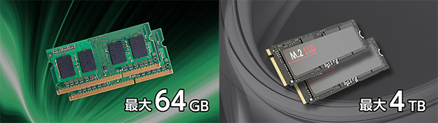 メモリは最大64GB(32GB×2)まで増設可能で、必要に応じた容量をBTOカスタマイズで選択できる。また、データの保存に必要な内蔵ストレージとして、NVMe接続に対応したM.2 SSDを標準搭載。BTOカスタマイズにより、最大4TB(2TB×2)のSSD増設やm最新のPCI Express Gen4×4接続に対応した、より高速なタイプも選択可能だ。