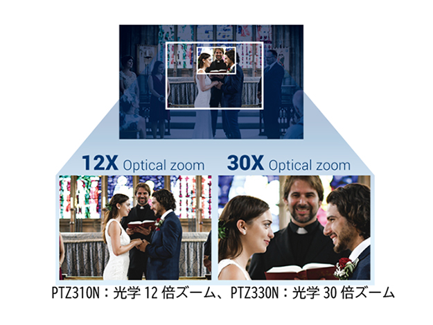 PTZ310NとPTZ330Nは、現行機種のリモートカメラ「PTZ310」と「PTZ330」の上位モデルで、型番末尾にNDI規格対応を表す「N」が付いている。PTZ310Nは光学12倍ズーム、PTZ330Nは光学30倍ズームを搭載しており、最大フルHD1080p・60fpsの映像出力に対応している。