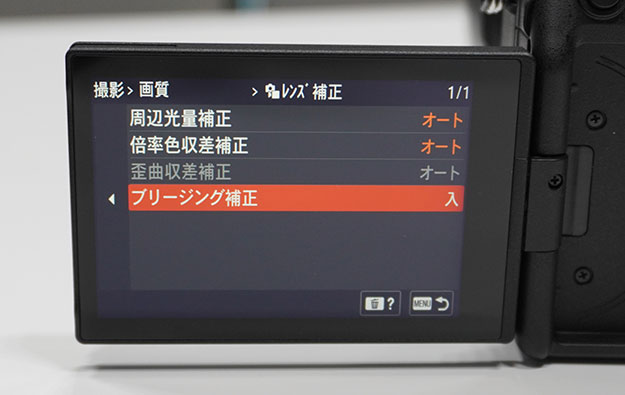 ※同機能は対応レンズでのみ使用可能。同機能をOnにすると画角と画質がわずかに変化。同機能をOnにしても、レンズによっては、補正しきれない場合がある。動画120p(100p)、S&Qモードの120p(100p)での撮影時、静止画モード時での撮影時では同機能は使用できない