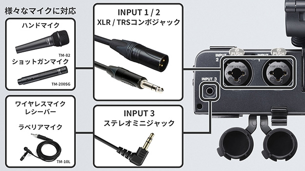 XLR/TRSコンボ入力端子2系統(マイク/ラインレベル切替え、+48Vファントム電源供給対応)に加え、3.5mmステレオミニ入力端子1系統を搭載。プラグインパワー対応マイクやワイヤレスマイクレシーバーの接続にも対応。また、振動ノイズに配慮したショックマウント機構付きマイクホルダー(本体から取り外し可能)と天面に配置されたコールドシューにより多様なマイク接続を実現するとしている。