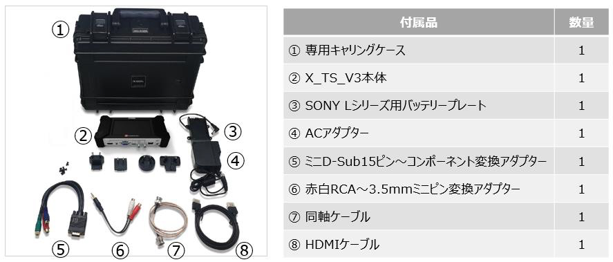 ソニー製Lシリーズ専用バッテリープレートを標準付属。 バッテリーと共にX_TS_V3の背面に装着することで、X_TS_V3のバッテリー駆動が可能になる。 ACアダプターでの電源供給が出来ない、外出先等でも利用できる。 またオプションにて、キヤノン製「LP-E6」互換バッテリー専用バッテリープレートも発売予定。