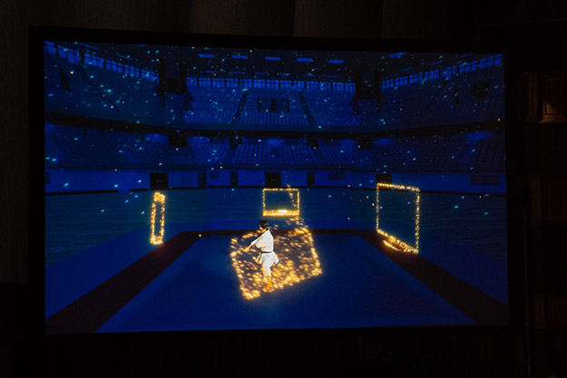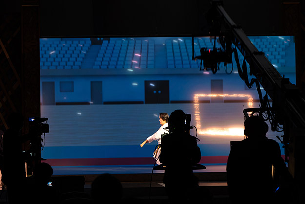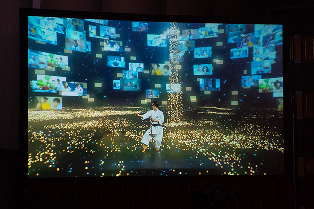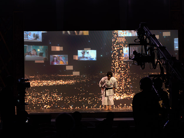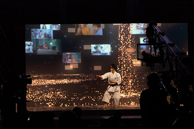 民放大会で特に話題になったのは、現実世界と仮想世界を融合させた空手・女子形の清水希容選手のオープニング演武演出だ。カメラの背景をすべてCGを背景にした今までにない視聴体験が大注目となっていた。今回は、会場ステージ上での見え方と配信映像との違いを比較しつつ、その部分をご覧いただきたい。